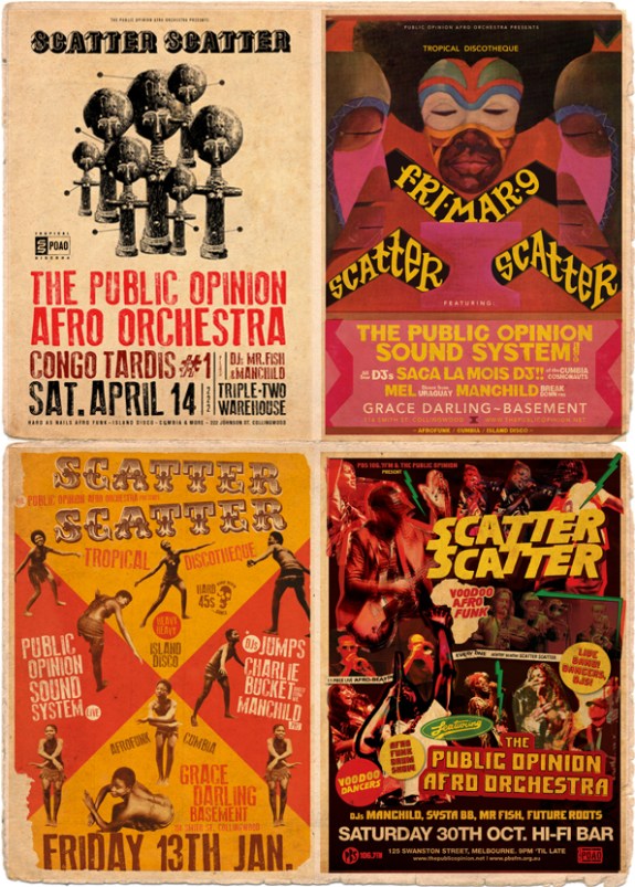 Scatter Scatter #4 is heating up to be the biggest yet, featuring The Public Opinion Afro Orchestra, Congo Tardis # 1 and Mr. Fish. Get your scatter on. Saturday April 14 at 222 Warehouse Fitzroy.
